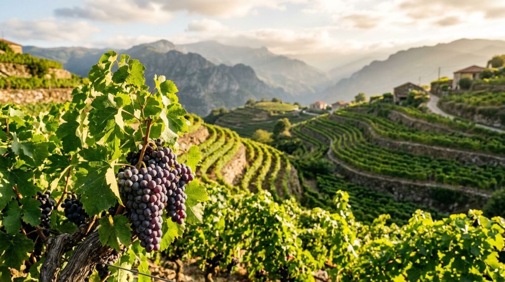 La sua vicenda si intreccia con una viticoltura antica, fatta di piccoli appezzamenti, monasteri, versanti difficili e lavoro manuale. Non è un’uva nata per le pianure facili. Al contrario, si è adattata bene ai rilievi interni del nord-ovest, dove l’altitudine e le forti escursioni termiche plasmano il carattere del vino.